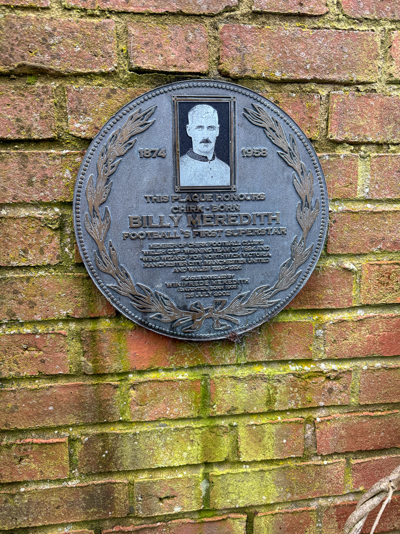Towards the end of Church St is a pleasant park with several plaques on the walls alongside the gates. One of these commemorates the achievements of Billy Meredith, who according to the plaque, was “Football’s first superstar”. In his career, he played for Chirk, Manchester City, Manchester United and the Welsh national team, amongst other teams.