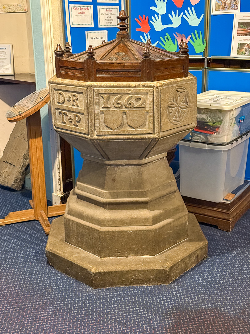 As can be seen below, the font dates to 1662. The central memorial is for members of the Myddelton family and also dates to the late 17th century. The stone, below right, is a marker for a heart-shrine found in the churchyard around a hundred years ago. In the 14th century an English knight, killed overseas, would be buried out there, but his heart would be removed and brought back for burial in Britain.