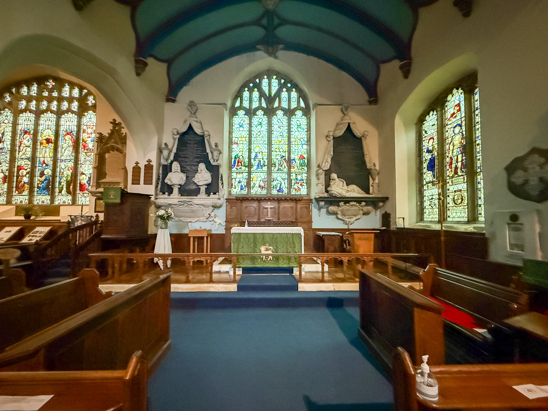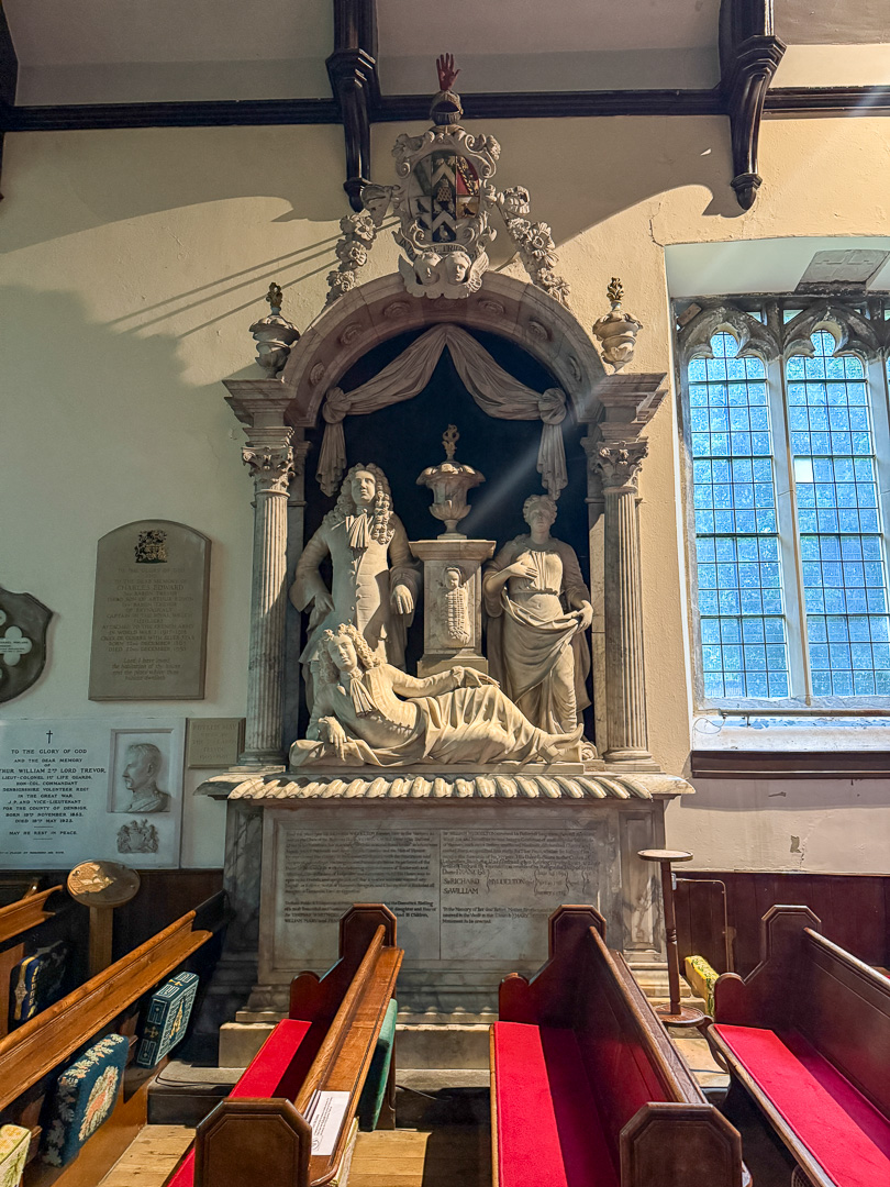 In the churchyard, is the Grade 2 listed Trevor Mausoleum, built in memory of the only daughter of the 2nd Baron Trevor who died in 1904 aged 5.