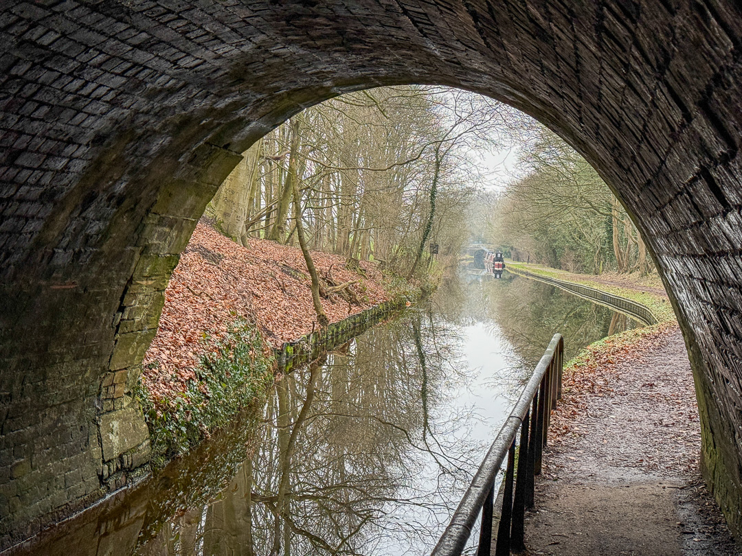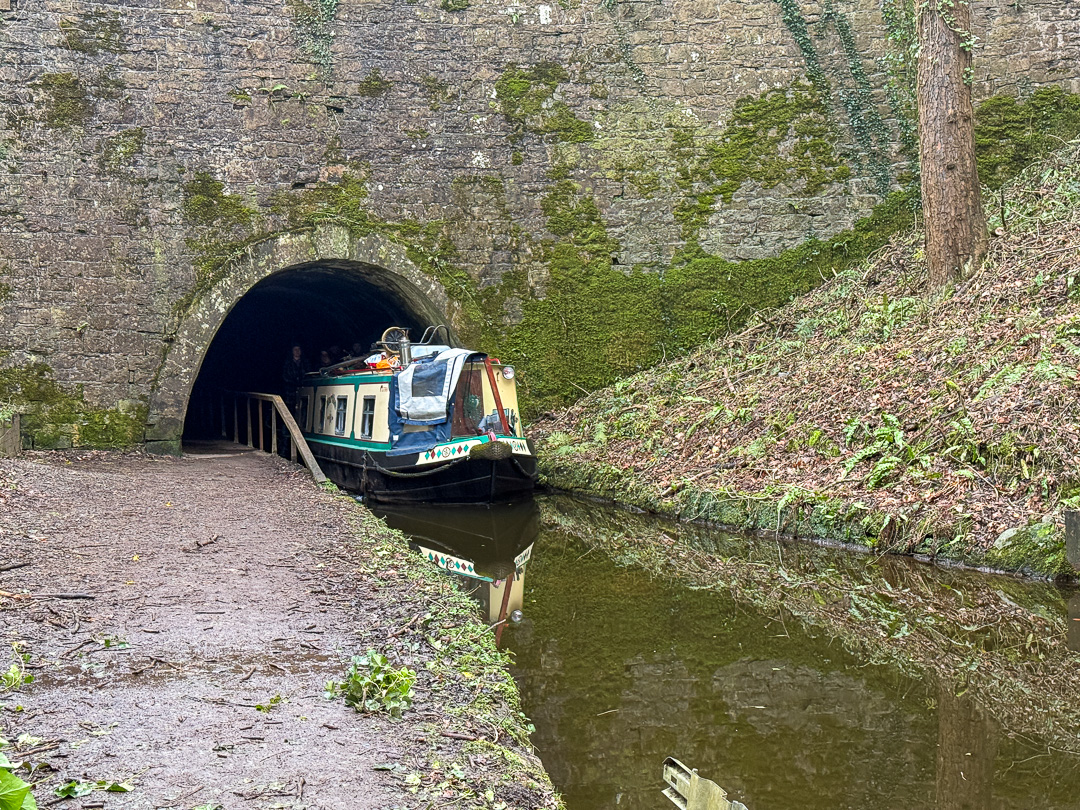 Today, we took a walk along the canal, starting by going through Chirk tunnel. On the way through we overtook a barge which emerged after us.