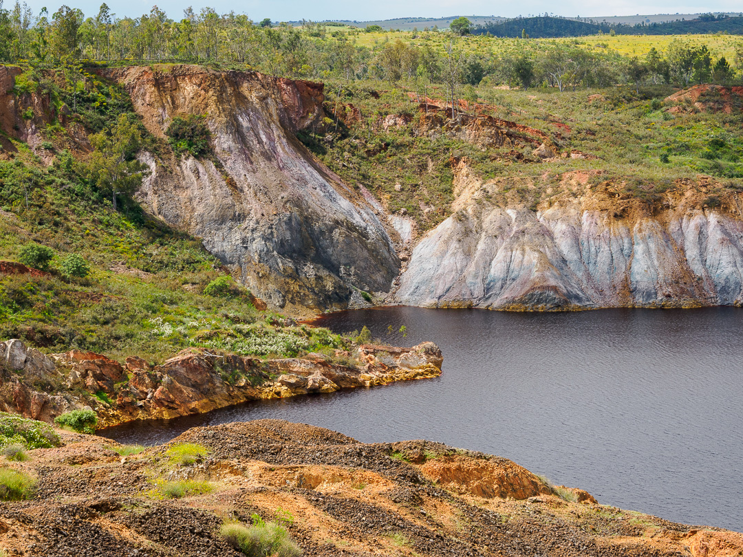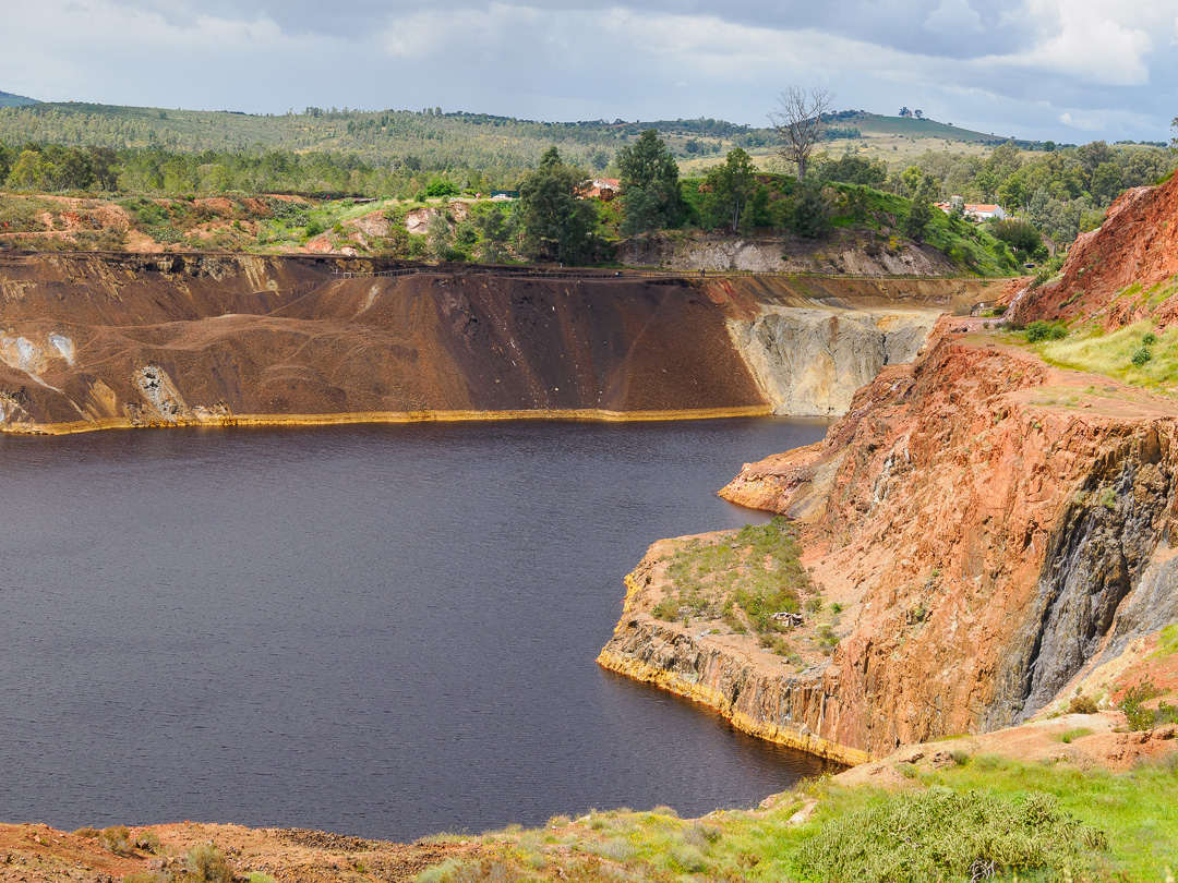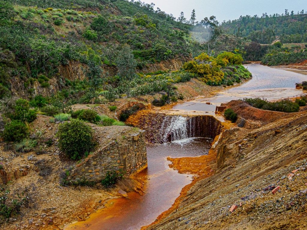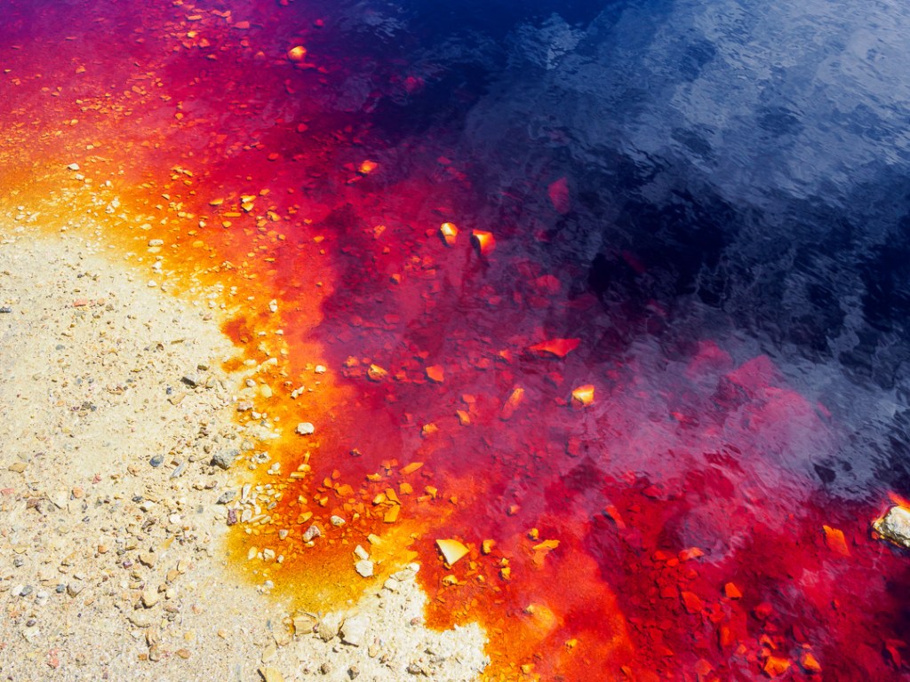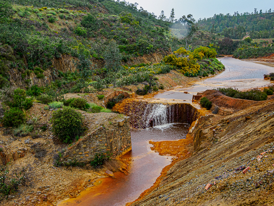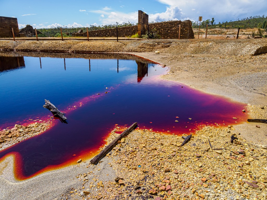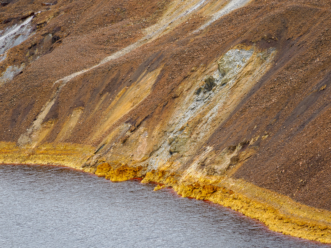 The colour of the water in the acidic lakes is blood red and seems to be contained; the water in the streams leaving the site is more of a rusty colour.