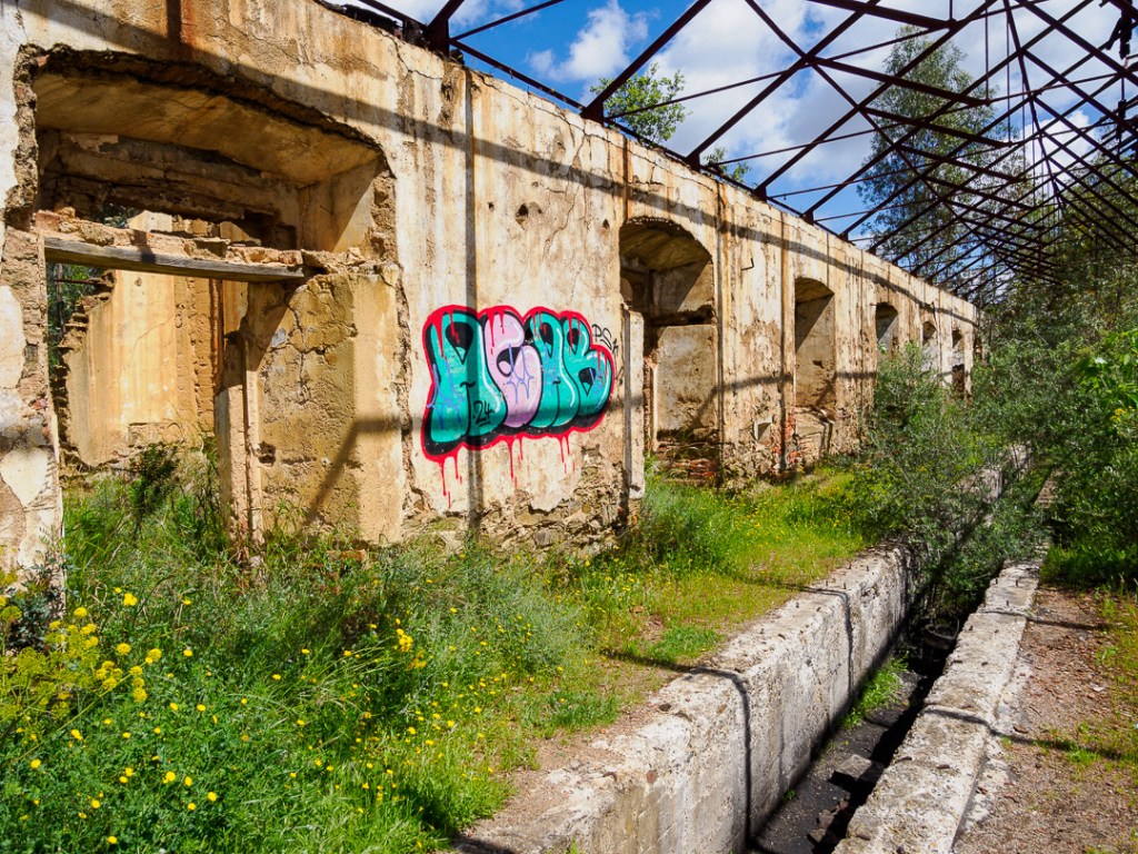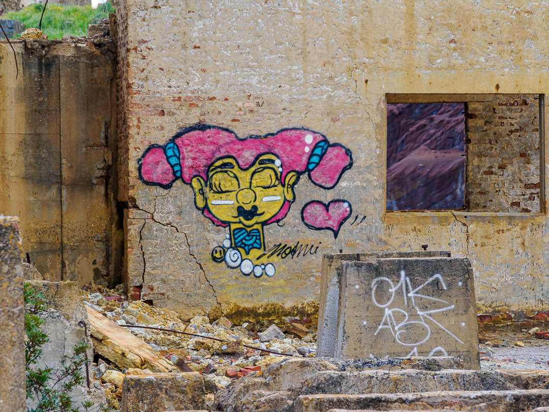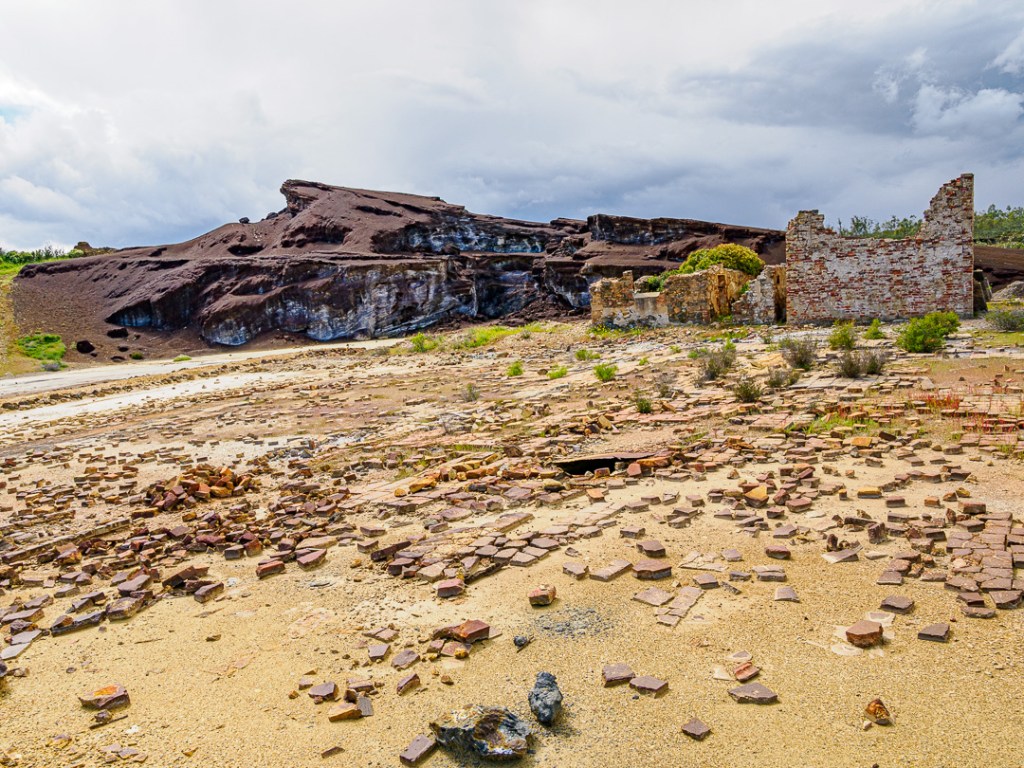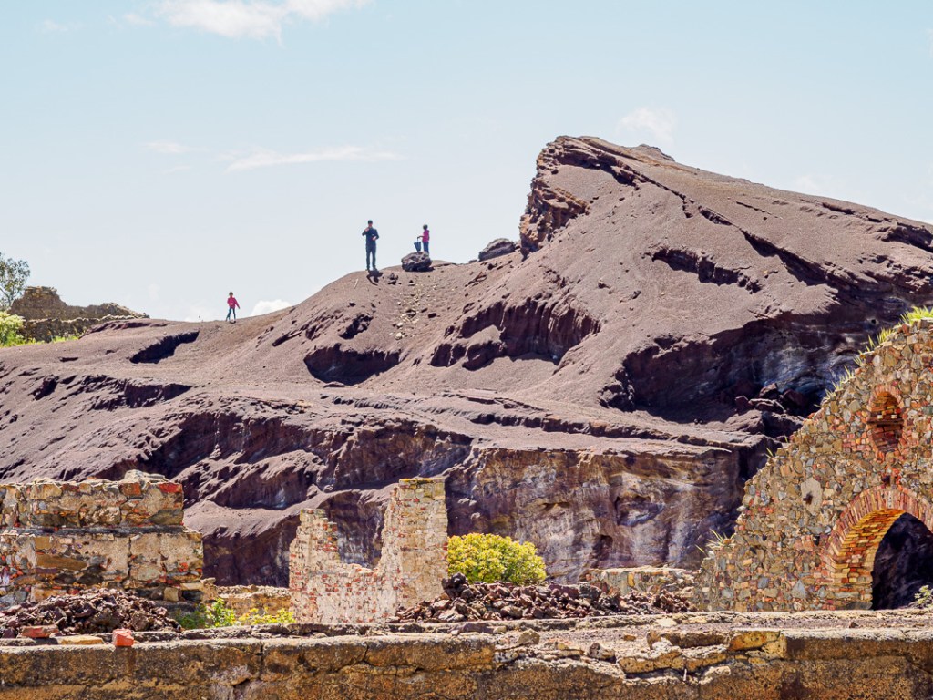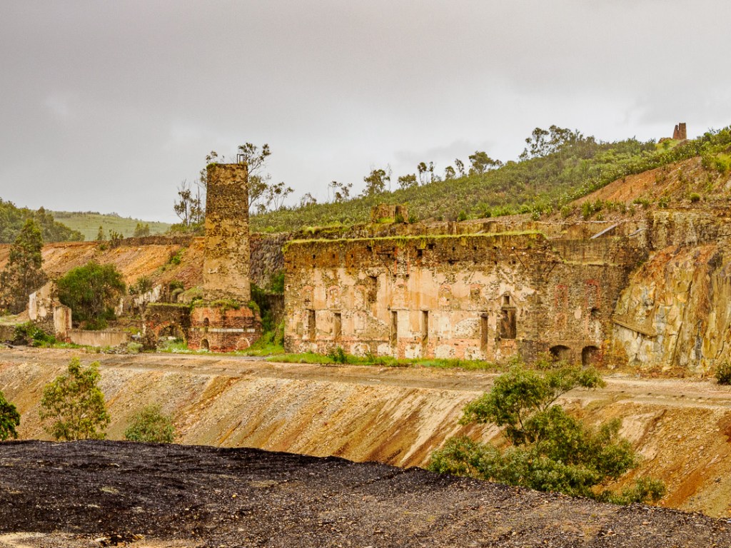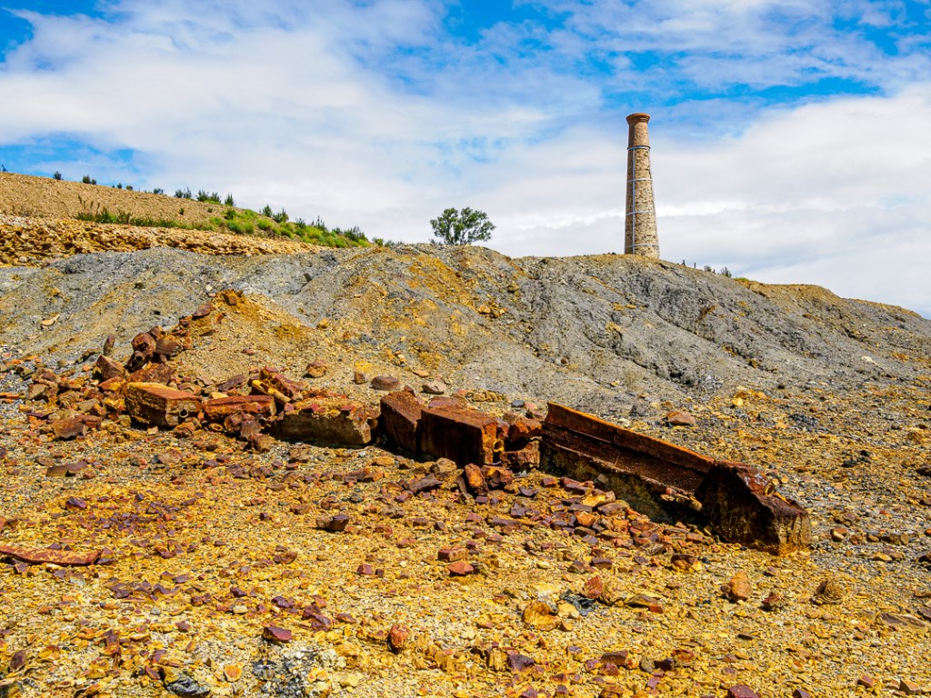 The extraction processes were very impactful on the environment. Copper ore was burned, which released highly toxic sulphurous fumes and poisoned the land. A large heap of burned ore remains on site, which has consolidated, but remains crumbly. It is seemingly used by local youth to carve their names into: