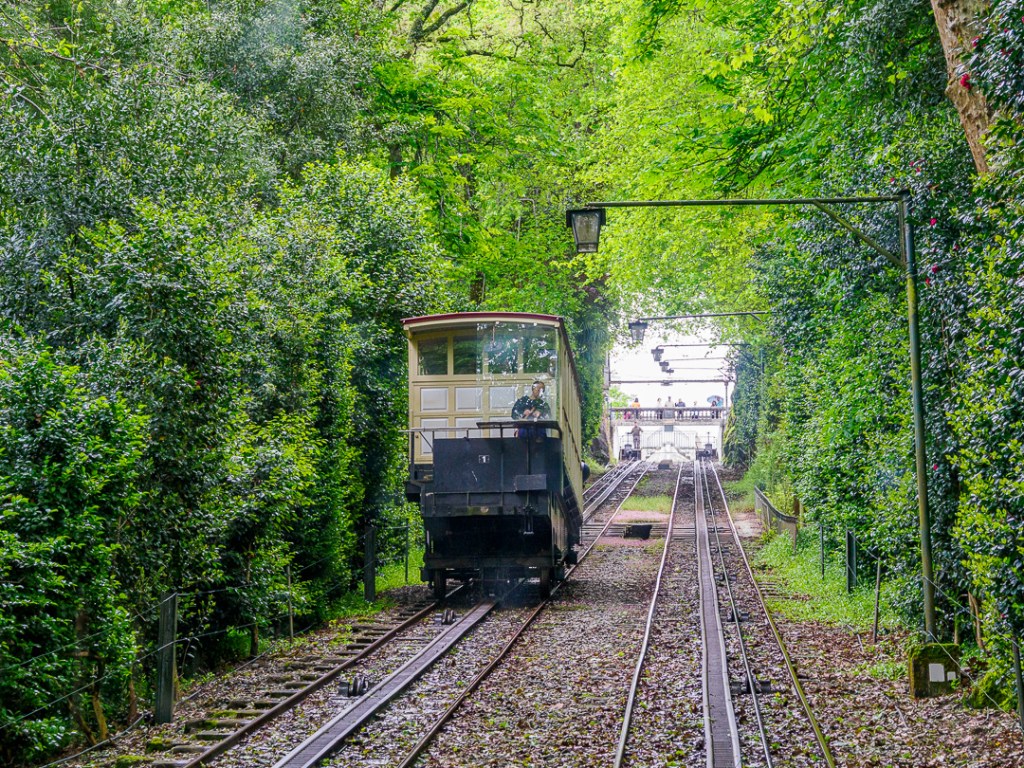 Part-way down, the path crosses the road. Here you can also see the funicular railway line: