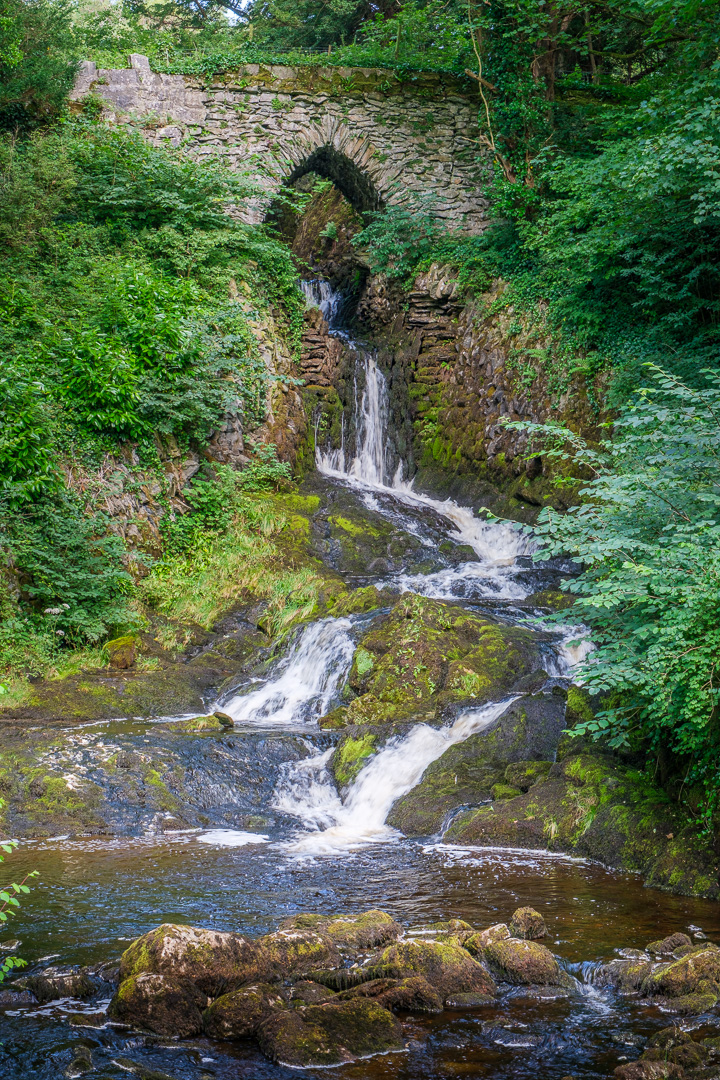 At the far end of the village there is the entrance to the Ingleborough Nature Trail which leads to Ingleborough Cave and onward to Gaping Gill pot, which we visited in 2021. Just near this entrance is a high waterfall with a footbridge over the top: