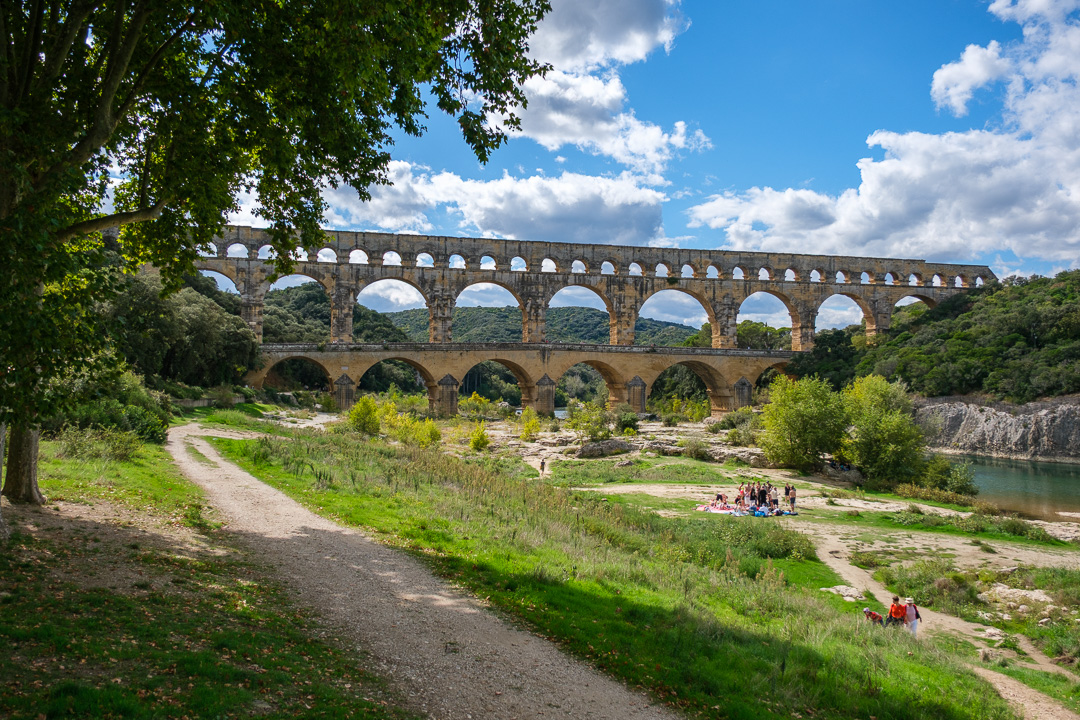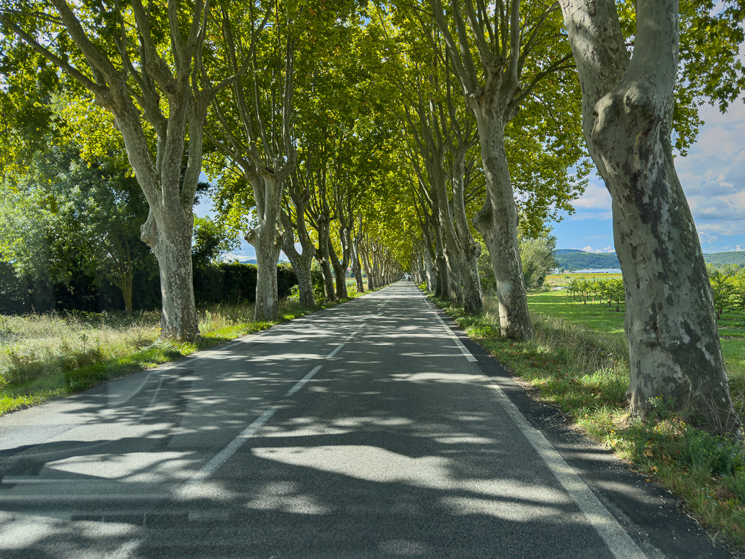 We headed further south today, but not too far. About an hour’s drive from our last stop, is the Roman Aqueduct known as the “Pont du Gard”, so we decided to visit. Along the way, we passed along many quintessentially French roads, dead-straight, with beautiful trees on each side: