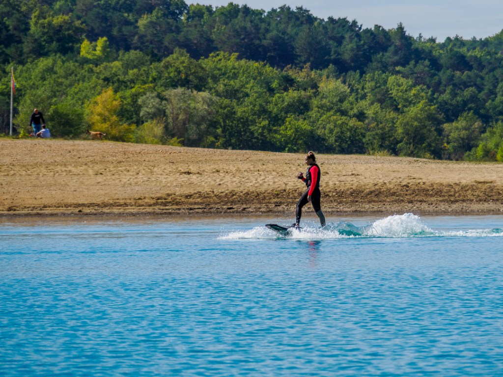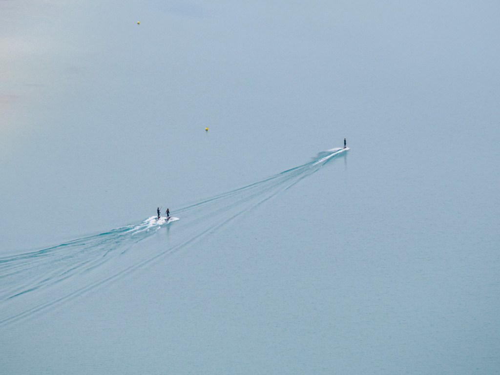 Whilst en-route we stopped to look down and saw many people enjoying the gorge on the river, which looked fun. So after travelling a bit further before being able to turn around, we returned to the lake-side. On the way down, we saw some people on electric powered surfboards. No need for a towing boat …a new one on me!