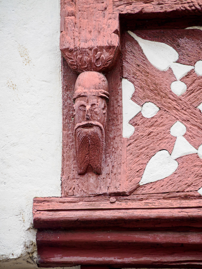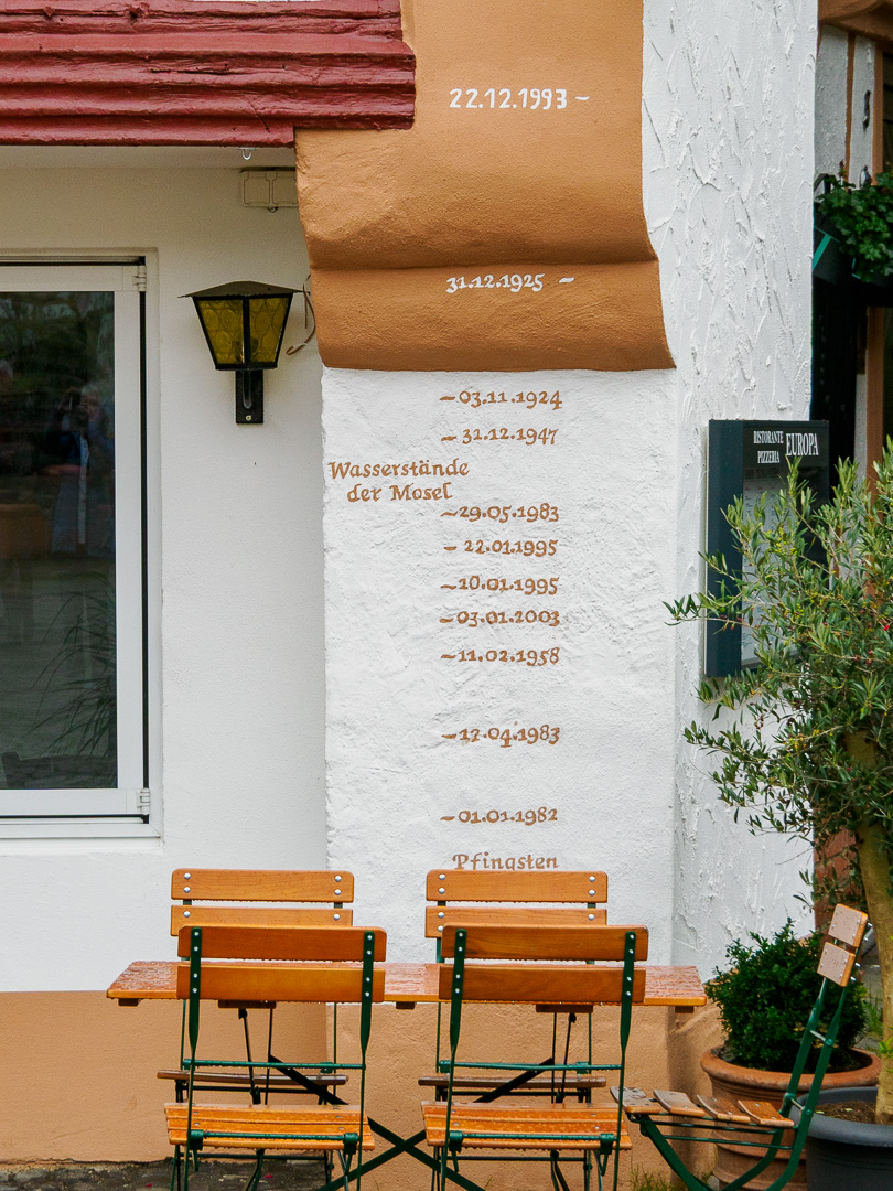 The town is right alongside the river, which has clearly flooded periodically over time, as the various marks on the corner of this building indicate. 1993 is the highest mark: