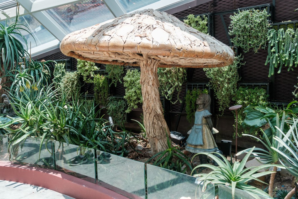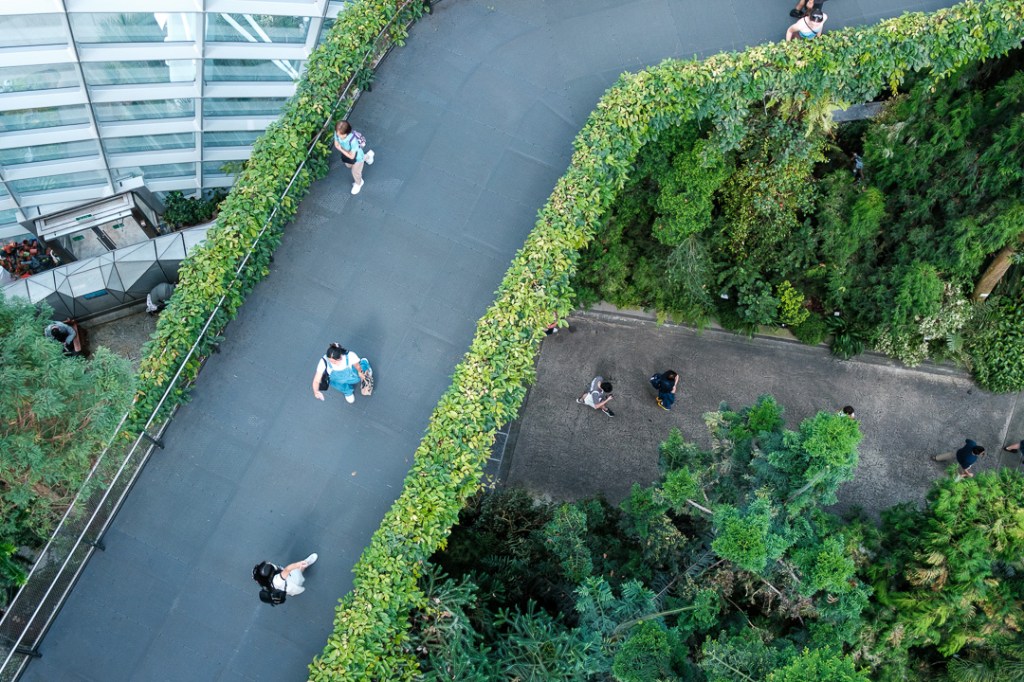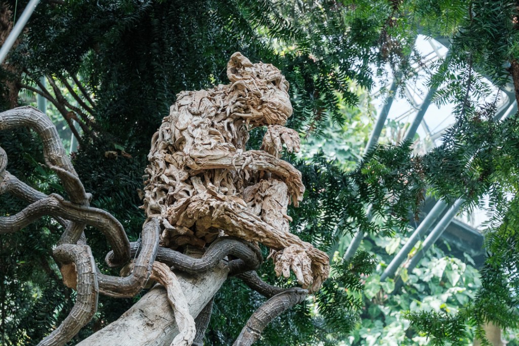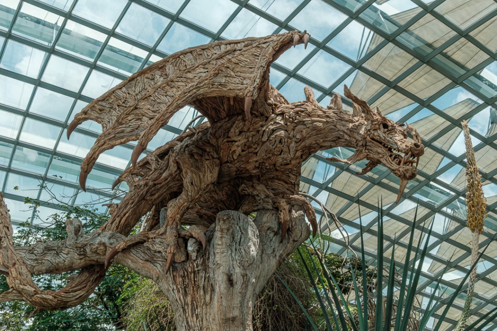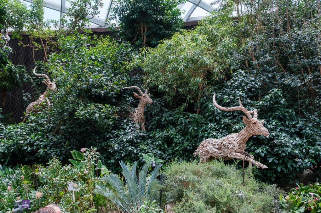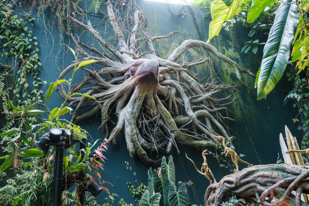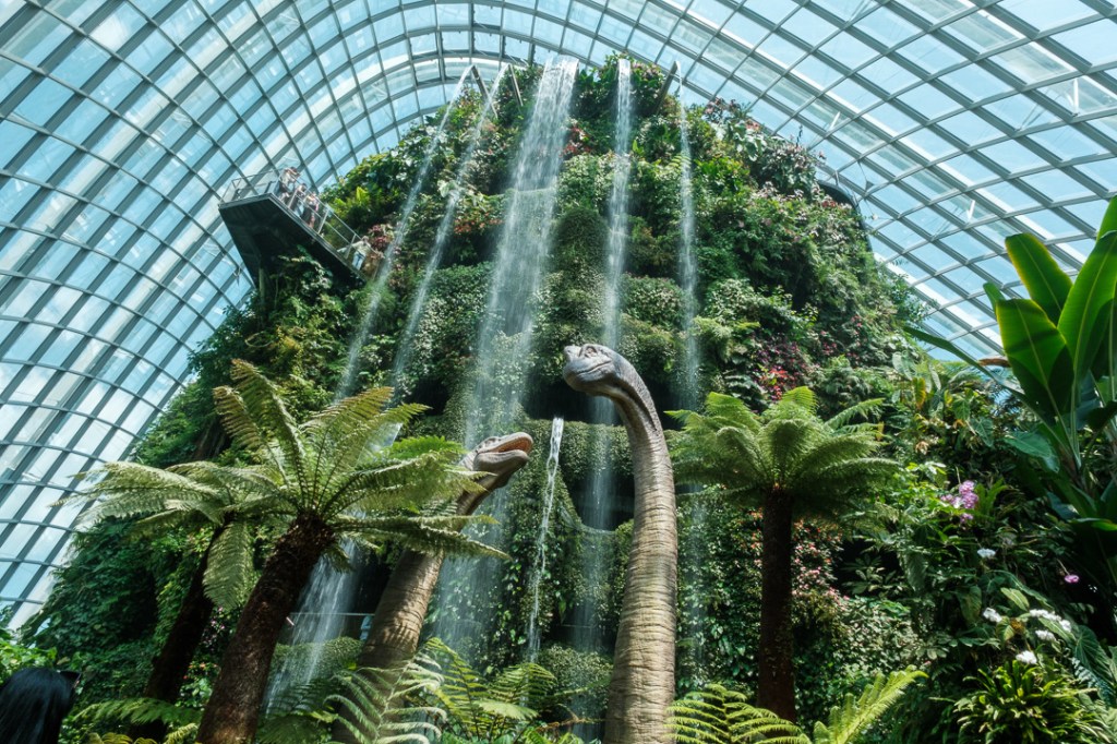 The second of the domes that we visited, The Cloud Forest, was “populated” by dinosaurs, paying homage to the film Jurassic Park. There was also an amazingly high waterfall and aerial walkways:
