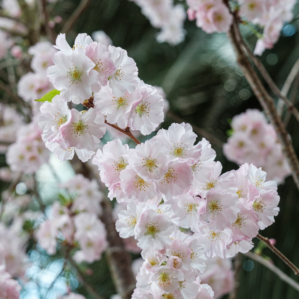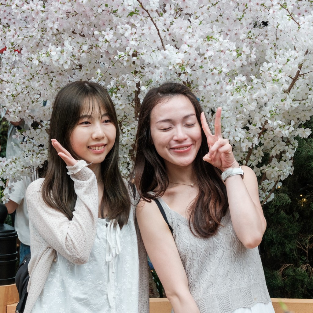 There is a beautiful Japanese garden which had many cherry trees in blossom. There were also many Japanese people.