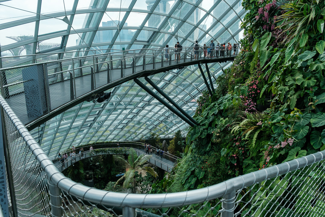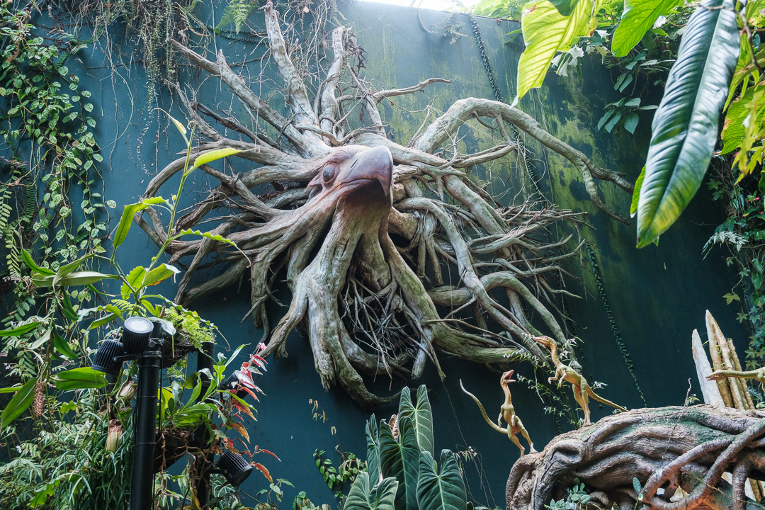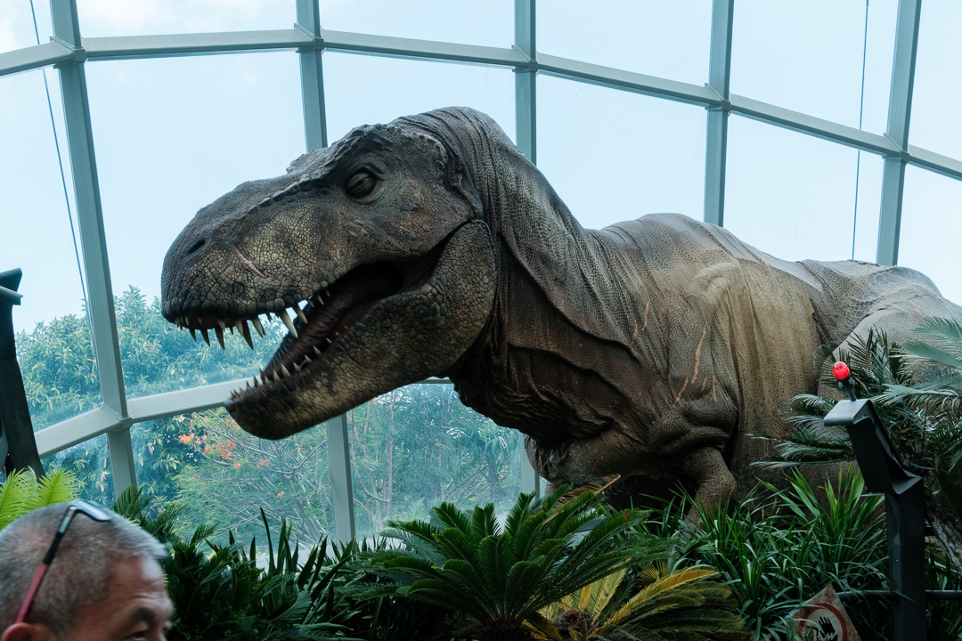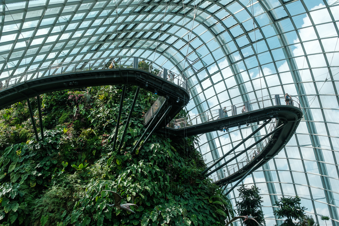 The second of the domes that we visited, The Cloud Forest, was “populated” by dinosaurs, paying homage to the film Jurassic Park. There was also an amazingly high waterfall and aerial walkways: