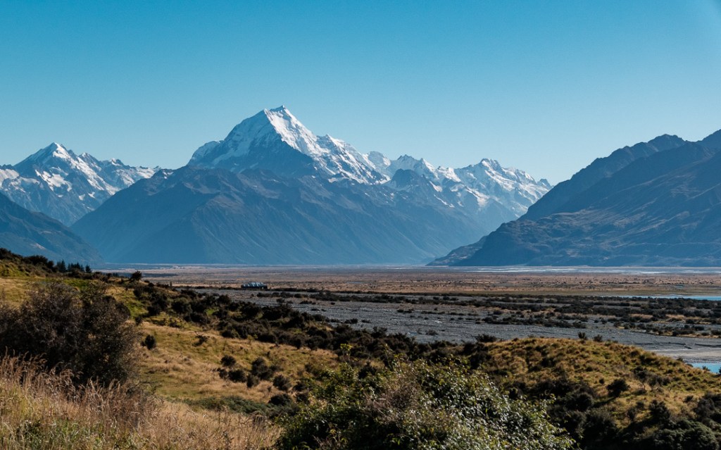 Mount Cook is the highest mountain in New Zealand. Situated in the central Southern Alps, it has three peaks, the highest being 3,724 metres or 12,218ft above sea level. As we arrived yesterday at the southern end of Lake Pukaki, we could see Mount Cook in the distance beyond the northern end of the lake.