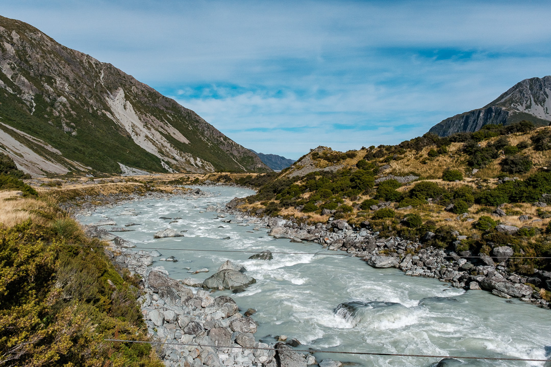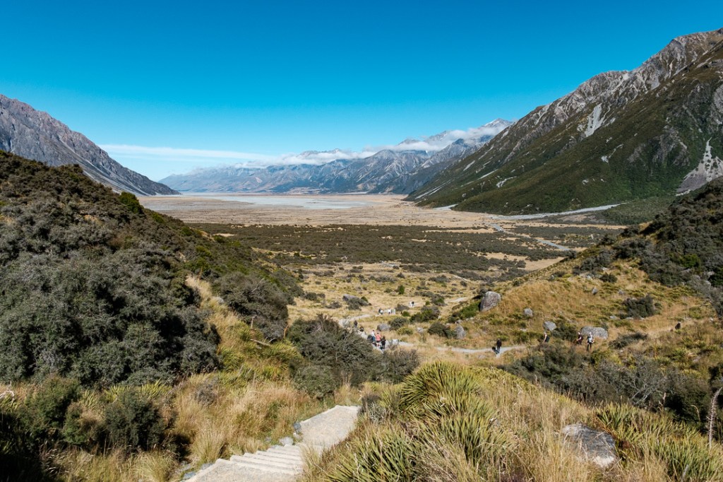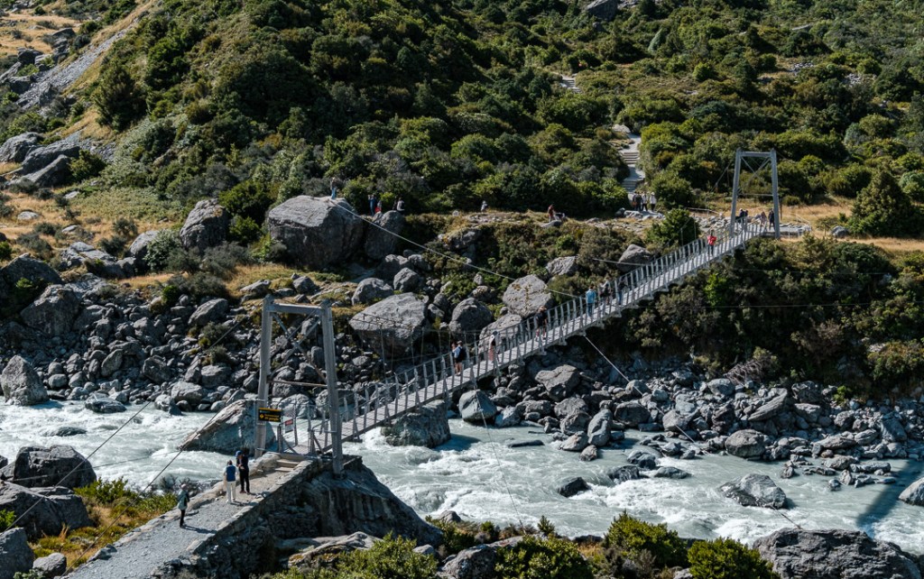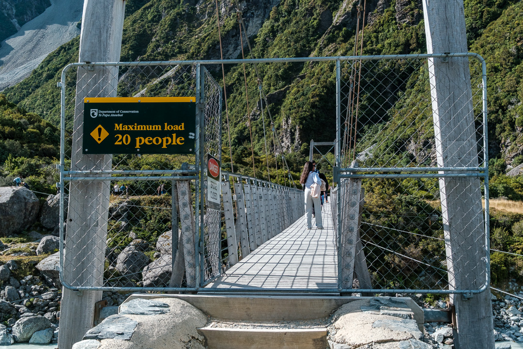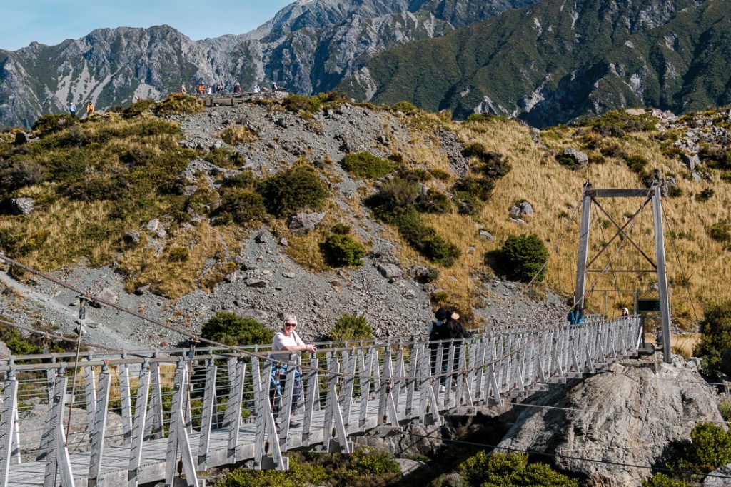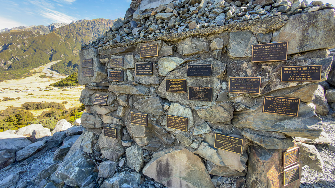 We walked along the Hooker Valley Track towards the first swing bridge and Lake Müller, passing the Alpine memorial along the way.