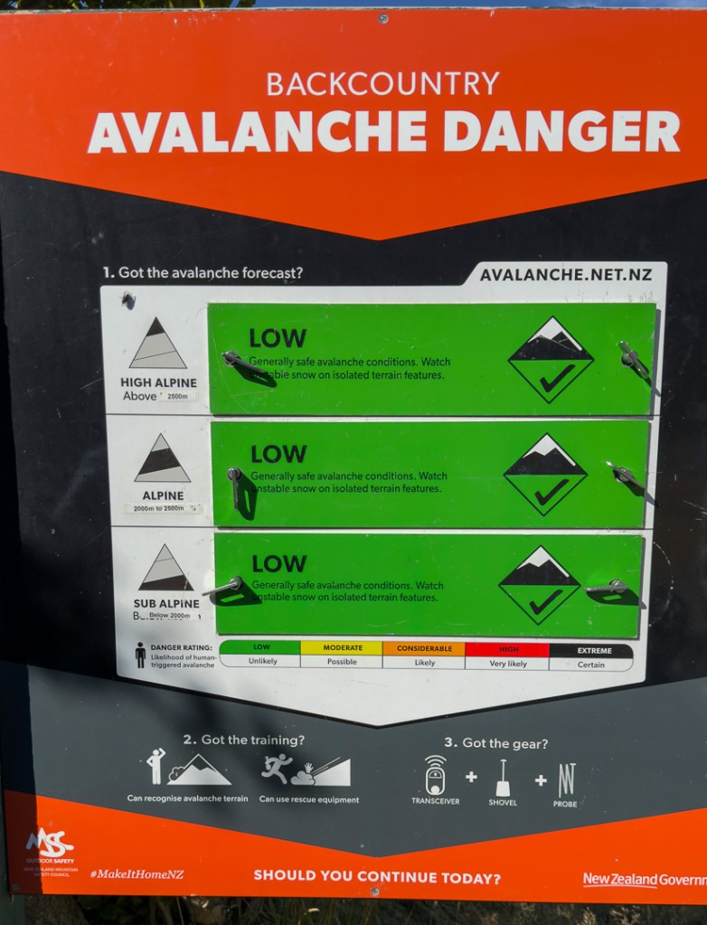 The memorial commemorates those who have lost their lives here, a reminder that there is real danger in these mountains. A further reminder is afforded by the avalanche risk notice board: