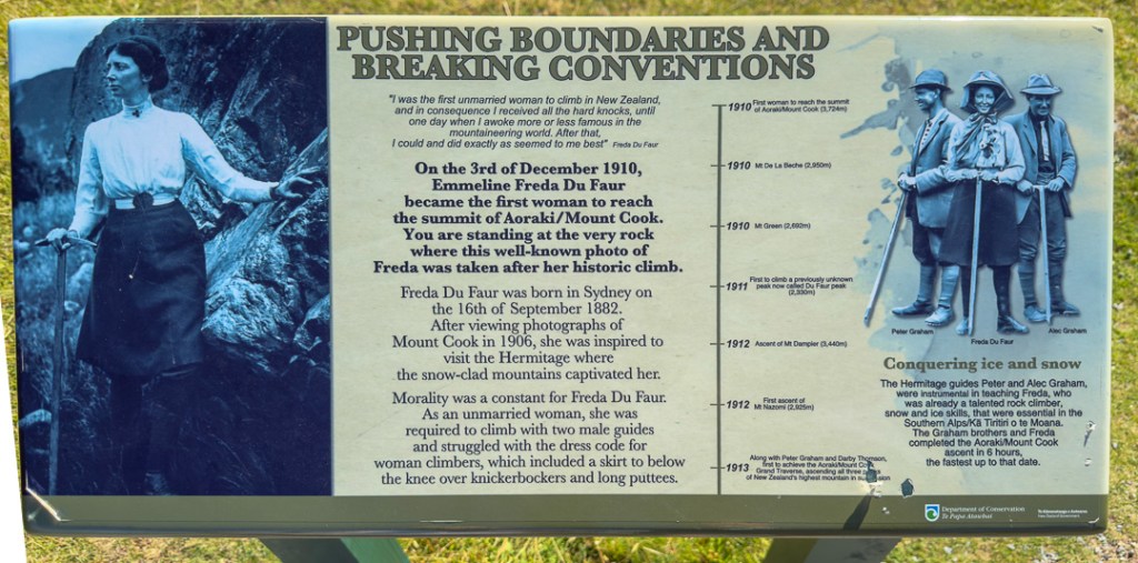 Nearby, we found “Freda’s Rock” when commemorates the achievements of Emmeline Freda Du Faur, the first woman mountaineer to reach the summit of Mt Cook. She is pictured at the rock below, in 1910.