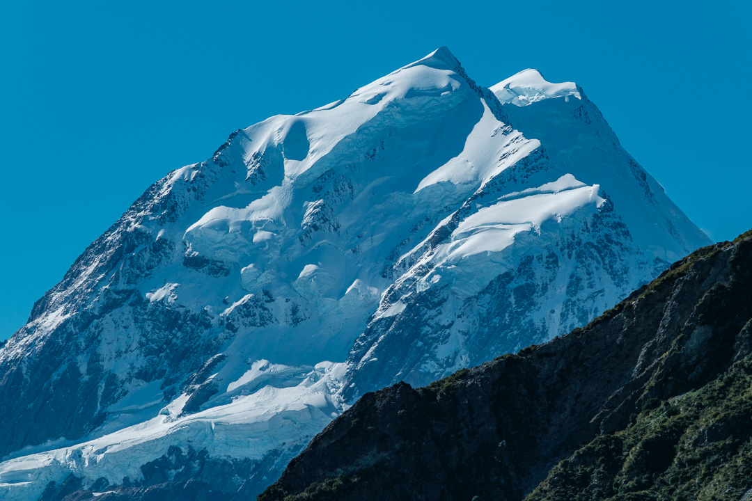 Returning back to the main road, we turned towards Aoraki / Mt Cook, then turned off again towards Hooker valley. At the head, there is a car park, camping ground and trail. Here, you can get a good view of Mt Cook: