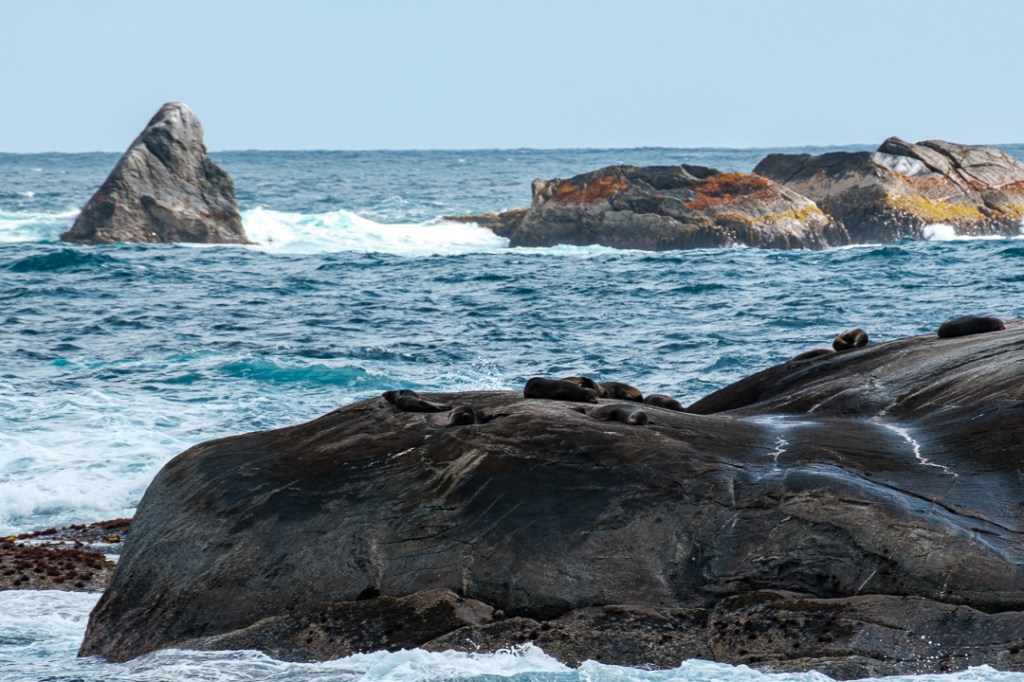 When we reached the sea, the boat was thrown about a fair bit, until we reached the shelter of some rocks on which there were a good number of fur seals basking: