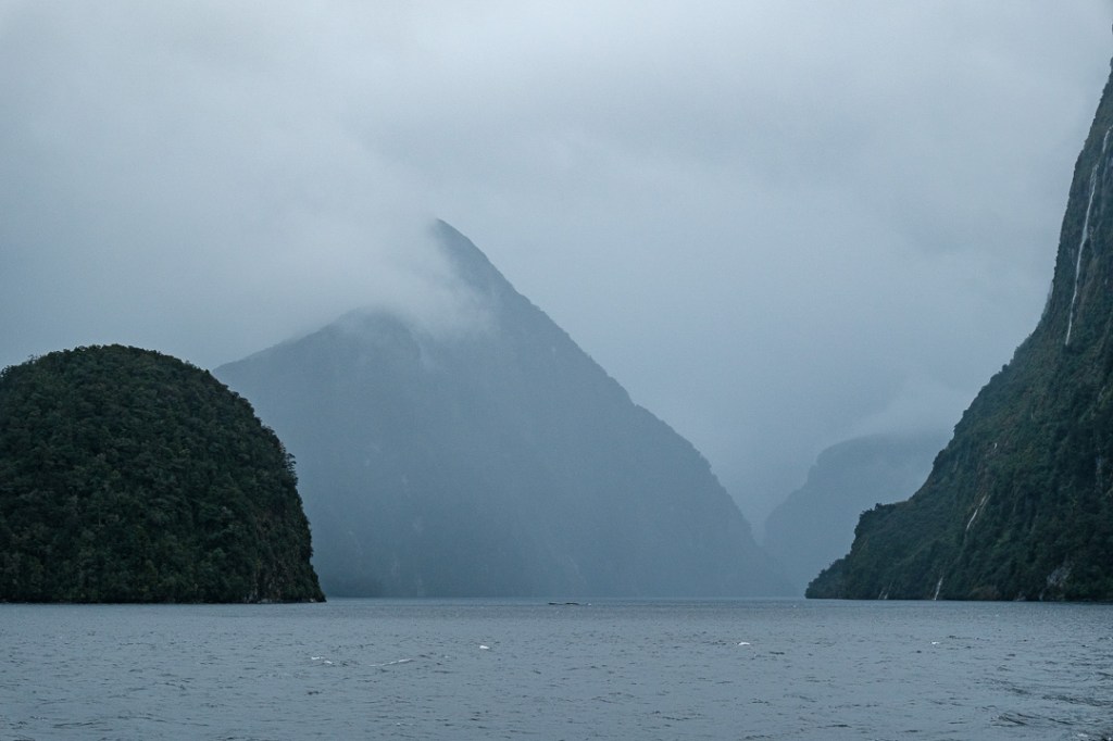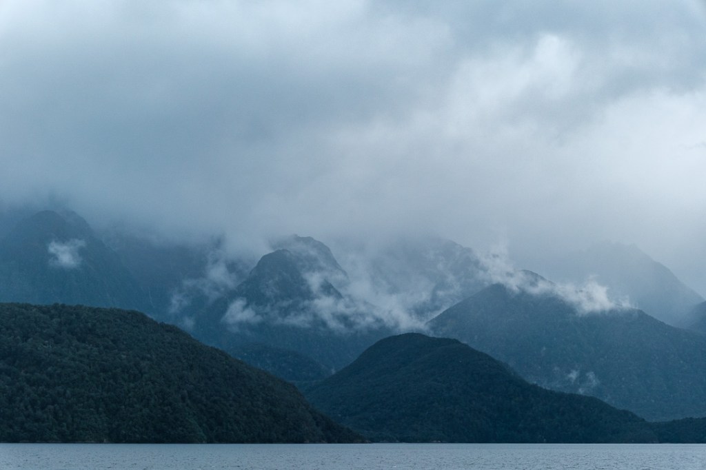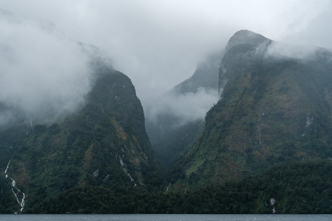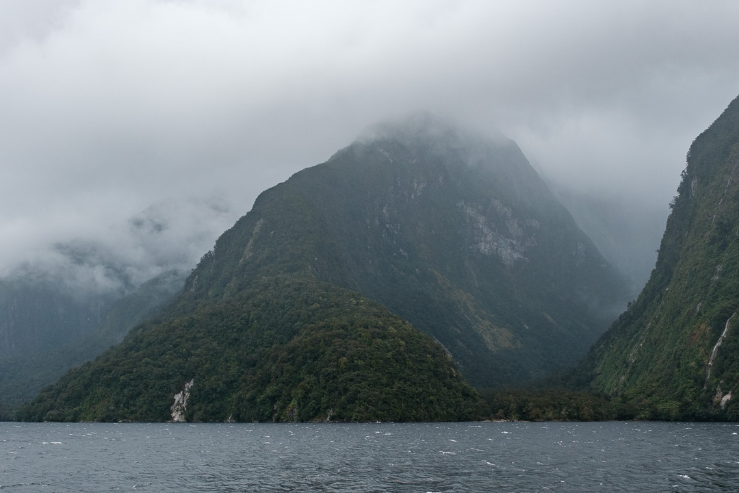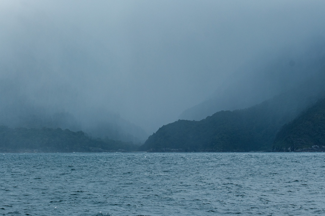 The larger passenger boat on Doubtful Sound then took us the length of the fjord. It was raining when we set off on the Sound, adding to the moody atmosphere: