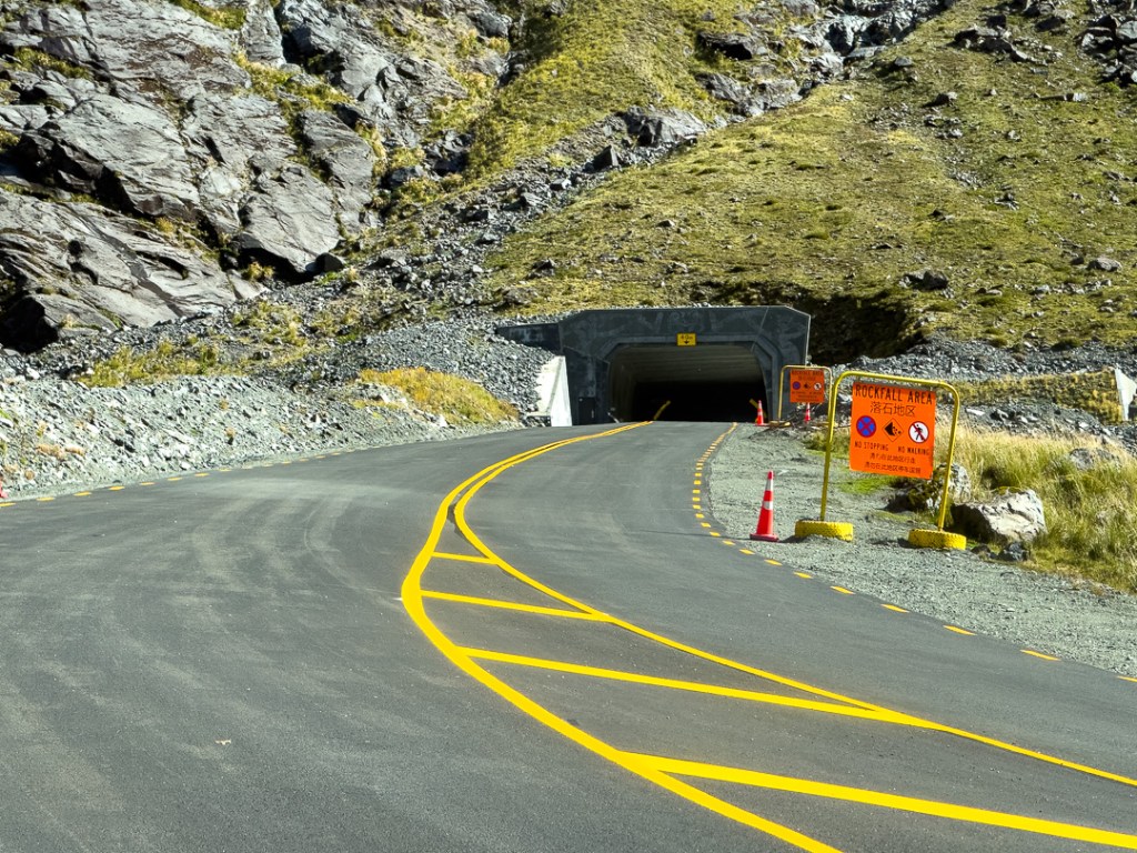 The road climbs steadily for many kilometres, reaching its summit at the mouth of a tunnel, through which the road slopes steeply downwards, then beyond with hairpin bends leading eventually to the parking area for Milford Sound.